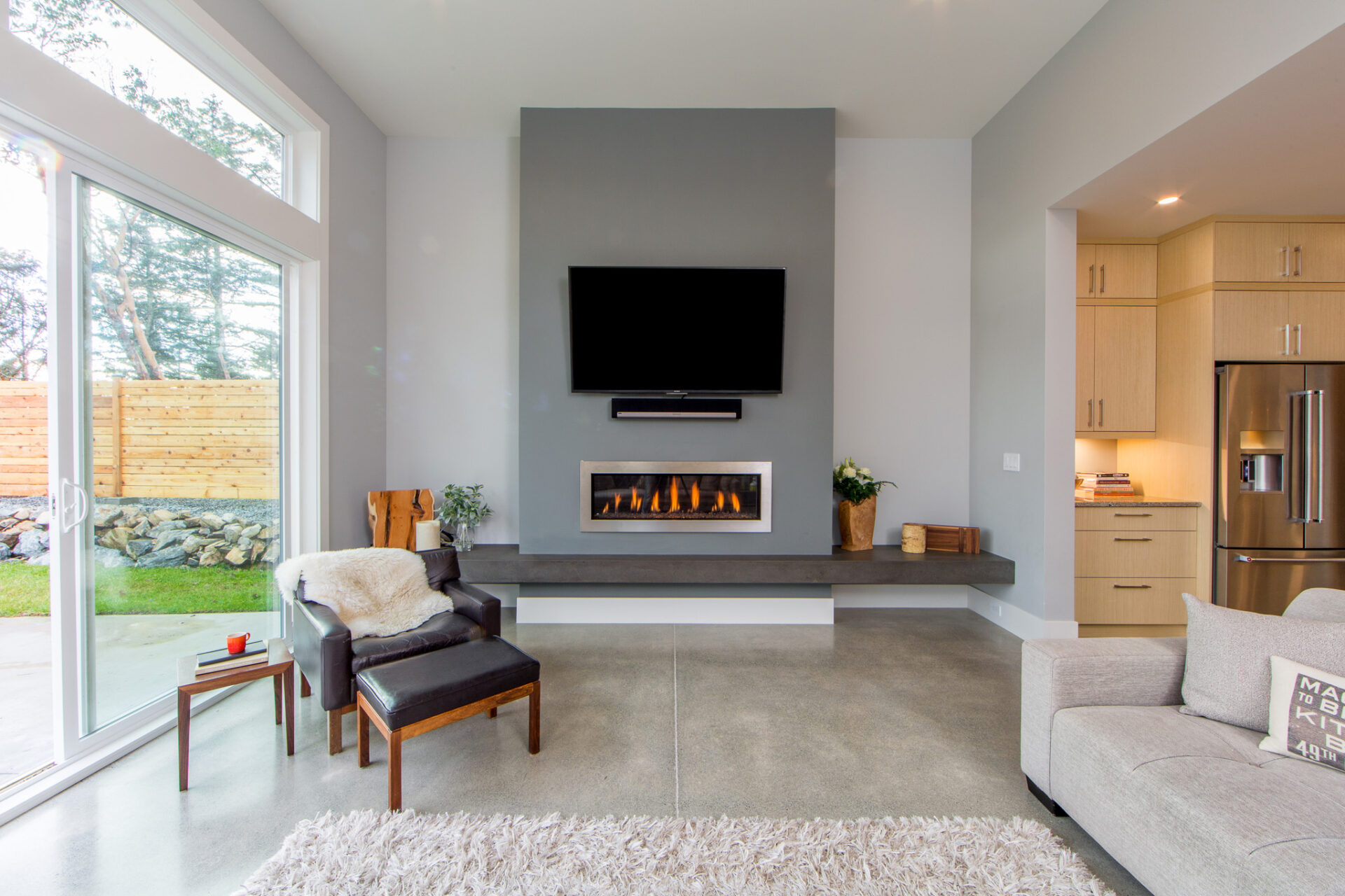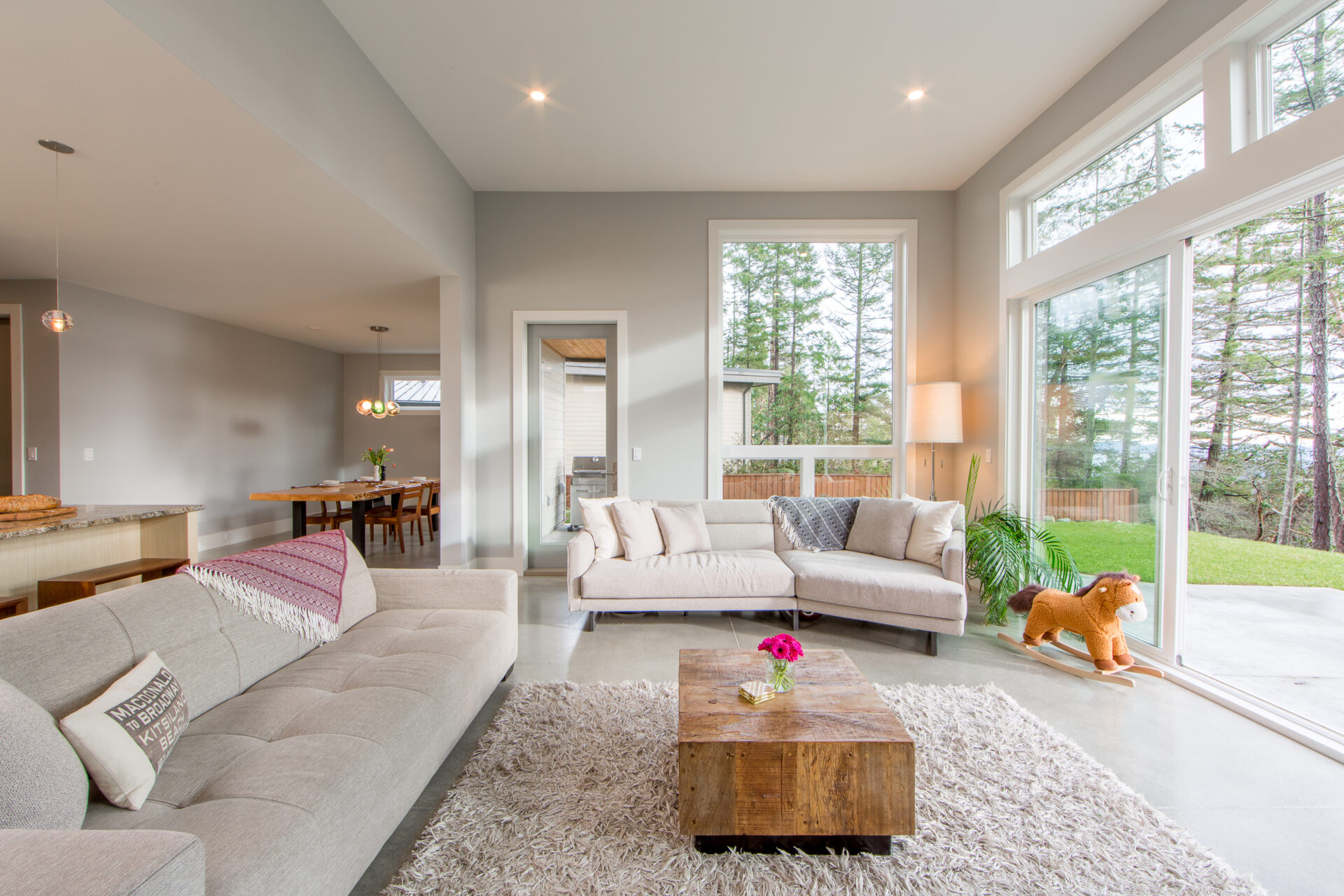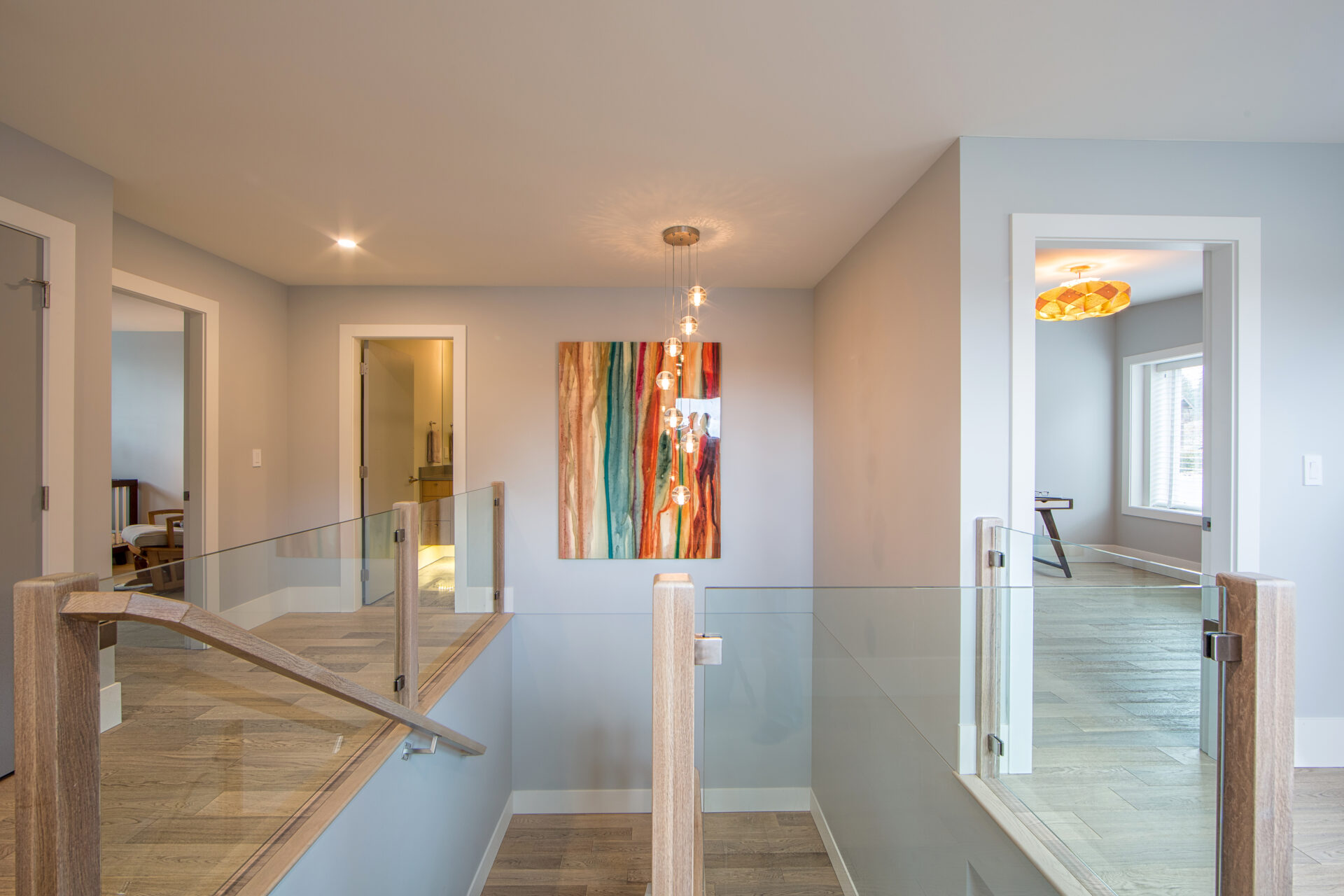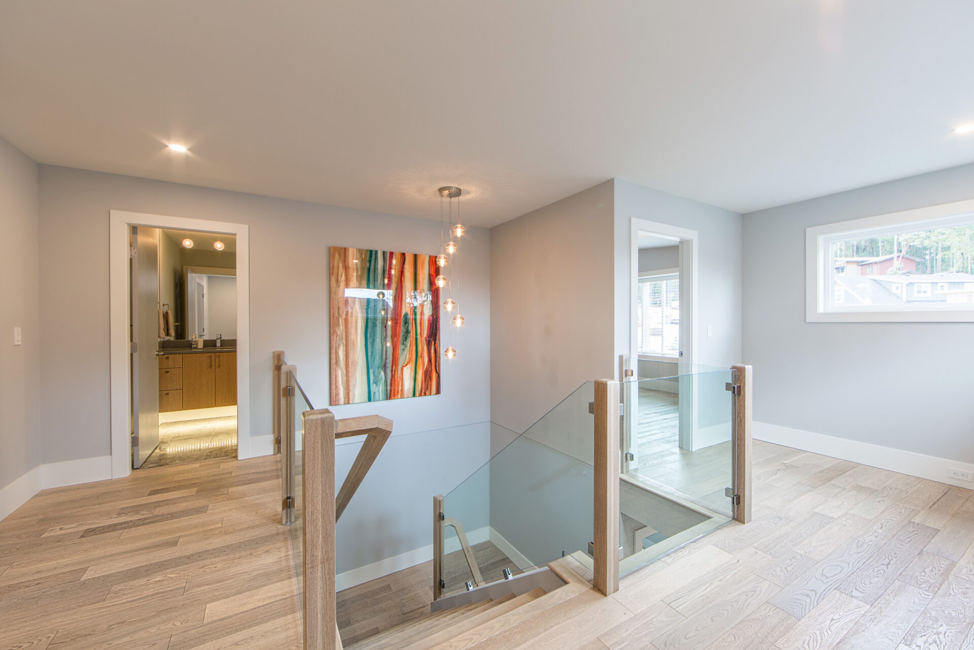 Creative Concepts Construction proudly presents Concrete Comfort, a stunning example of West Coast modern design tailored for family living. The exterior features a blend of Hardi Plank siding and natural stone accents, warm cedar soffits, and striking post-and-beam elements. Inside, the main level showcases polished concrete floors, while the upper level and staircase feature brushed engineered hardwood in a light oak finish. The custom staircase built by Creative Concepts’ talented carpenters pairs glass panels with handcrafted oak nosings for a seamless finish.