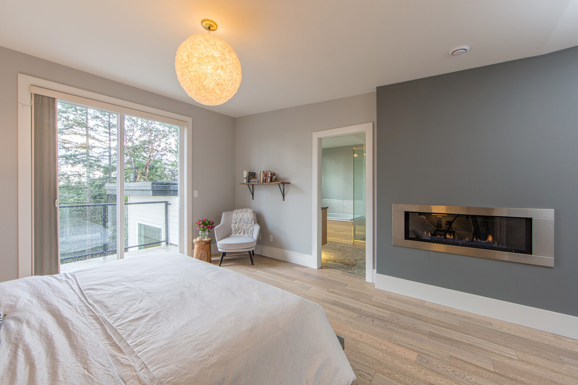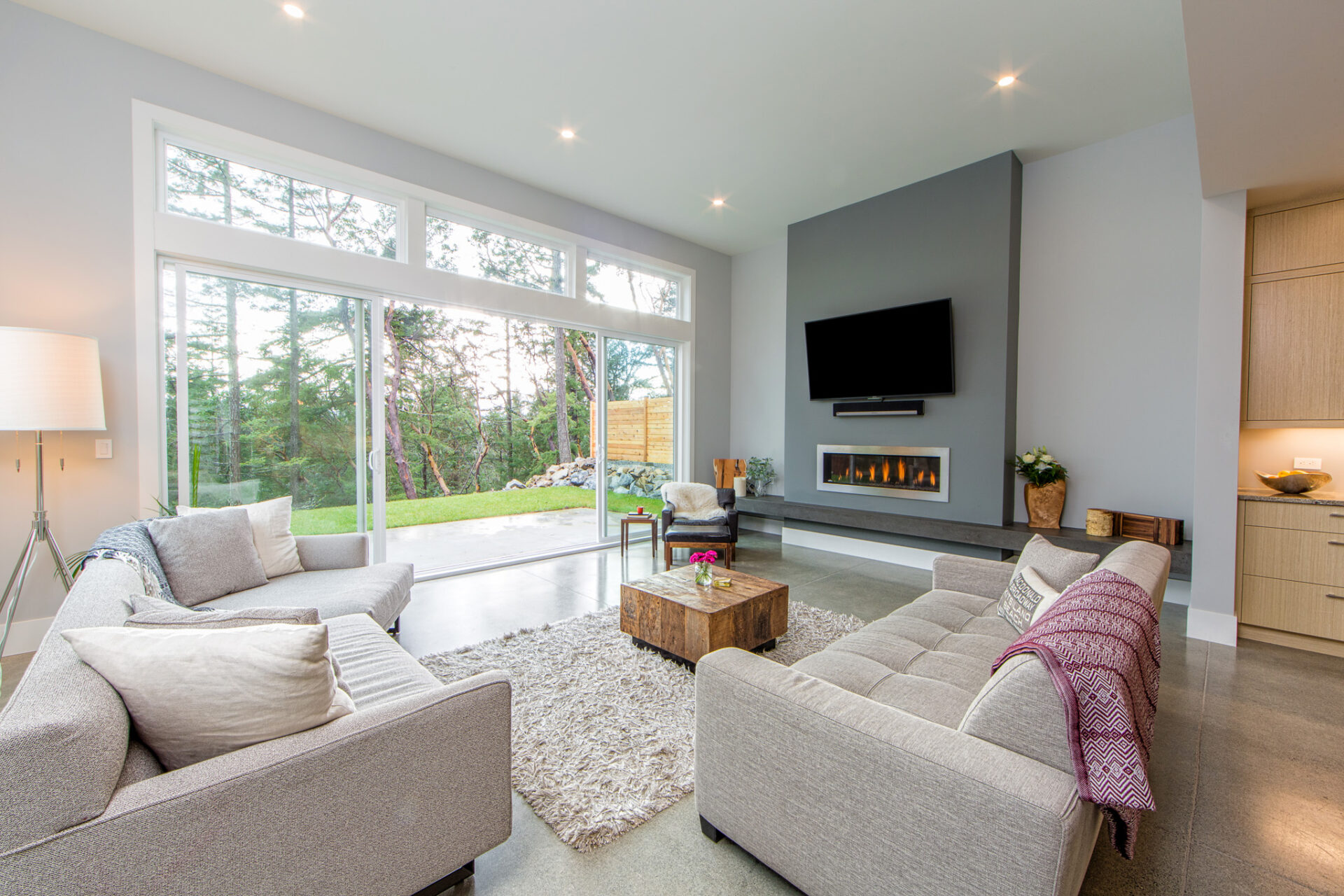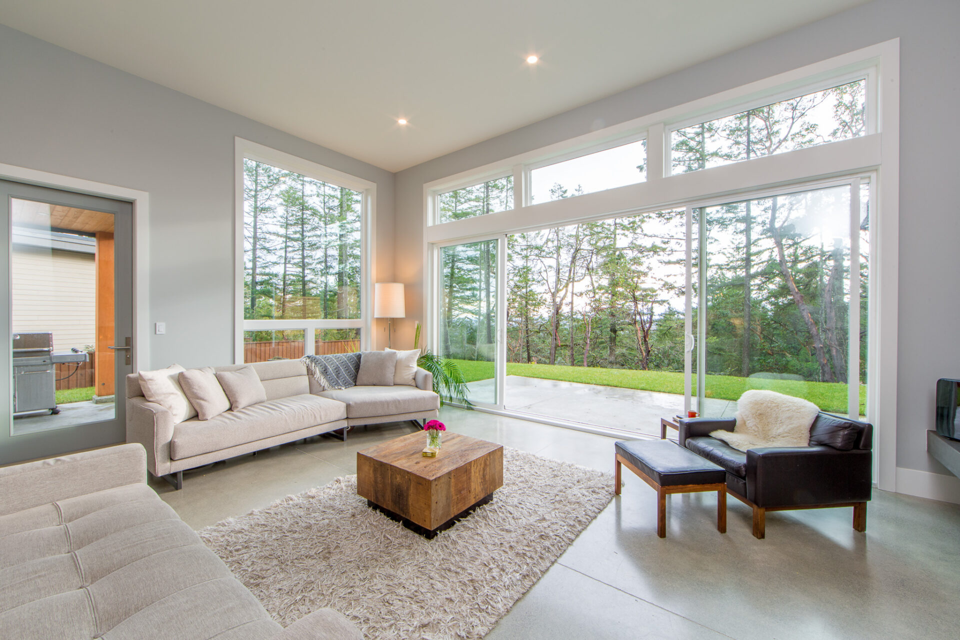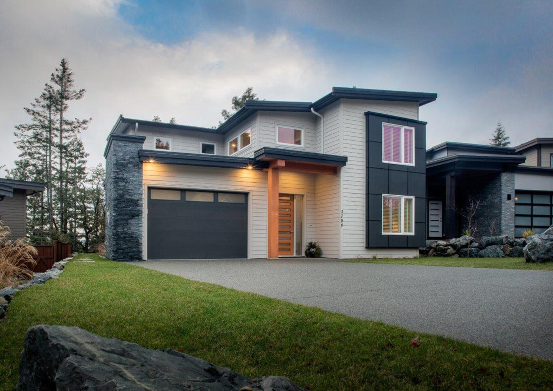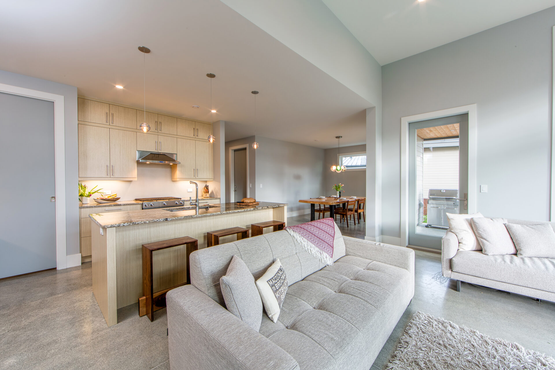 Creative Concepts Construction proudly presents Concrete Comfort, a stunning example of West Coast modern design tailored for family living. The exterior features a blend of Hardi Plank siding and natural stone accents, warm cedar soffits, and striking post-and-beam elements. Inside, the main level showcases polished concrete floors, while the upper level and staircase feature brushed engineered hardwood in a light oak finish. The custom staircase built by Creative Concepts’ talented carpenters pairs glass panels with handcrafted oak nosings for a seamless finish.
