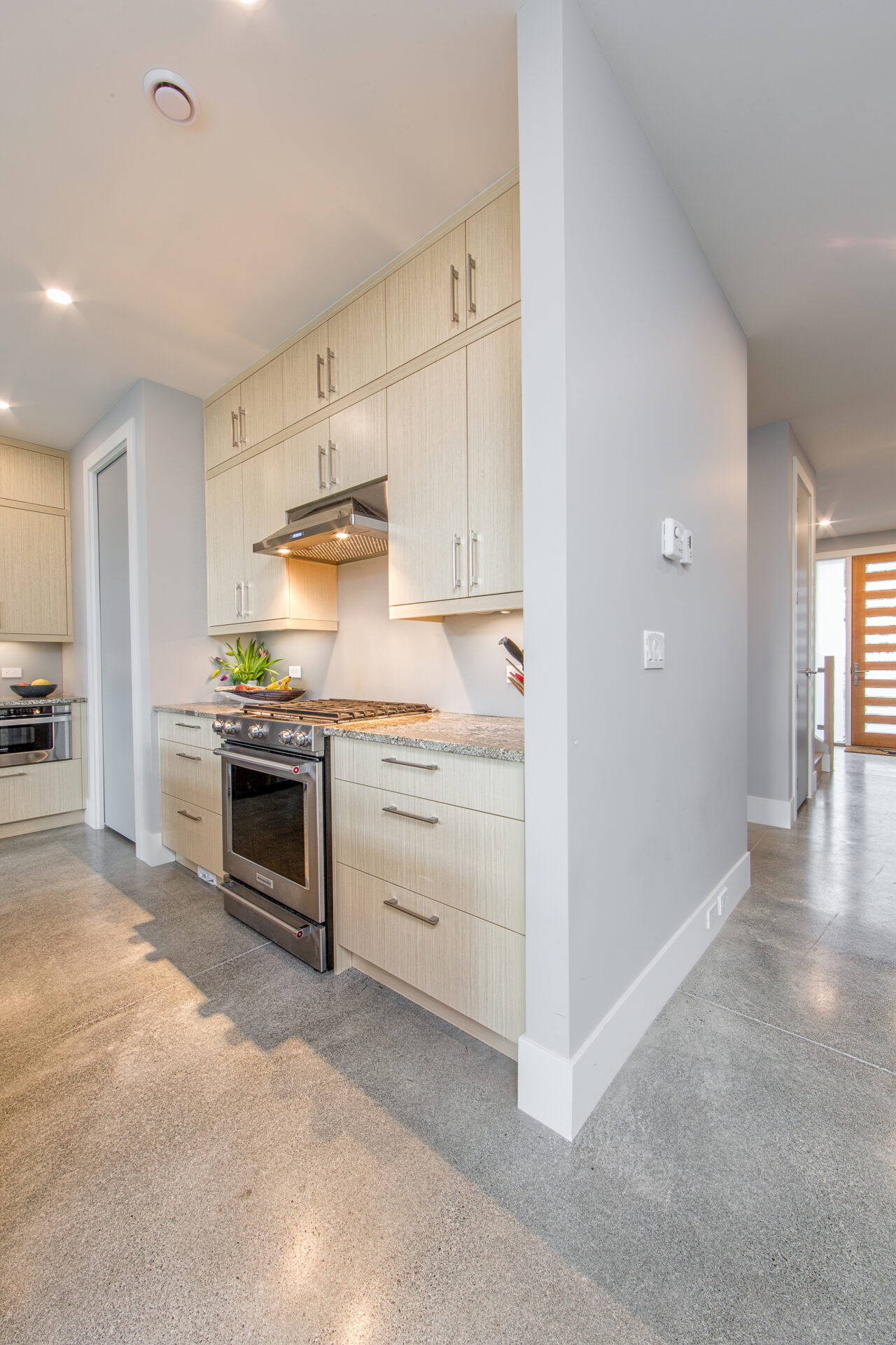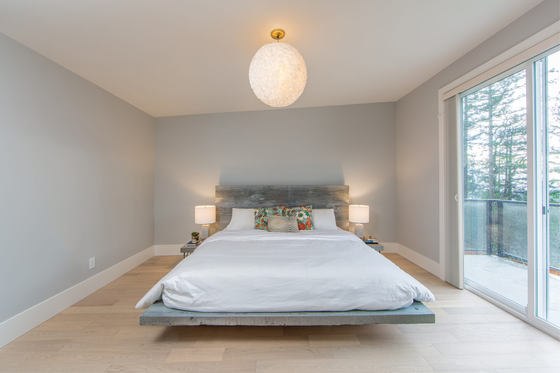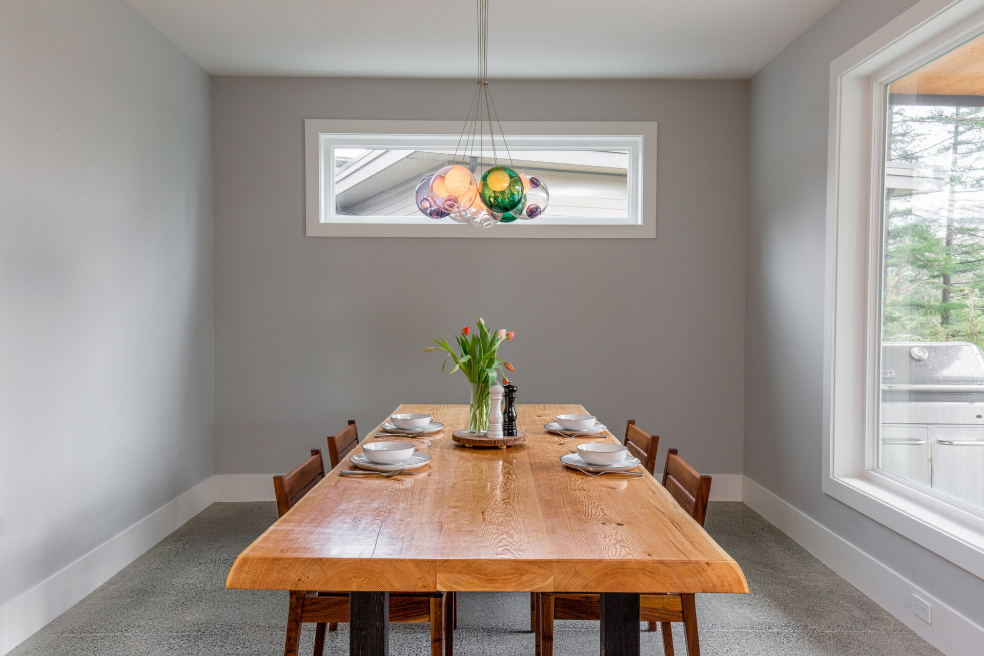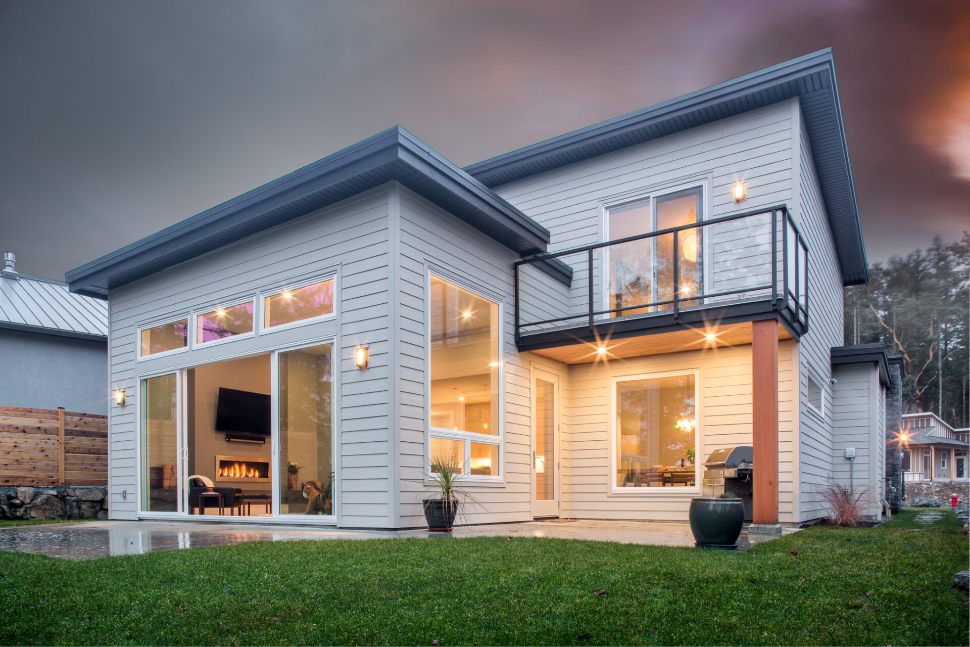 Creative Concepts Construction proudly presents Concrete Comfort, a stunning example of West Coast modern design tailored for family living. The exterior features a blend of Hardi Plank siding and natural stone accents, warm cedar soffits, and striking post-and-beam elements. Inside, the main level showcases polished concrete floors, while the upper level and staircase feature brushed engineered hardwood in a light oak finish. The custom staircase built by Creative Concepts’ talented carpenters pairs glass panels with handcrafted oak nosings for a seamless finish.
