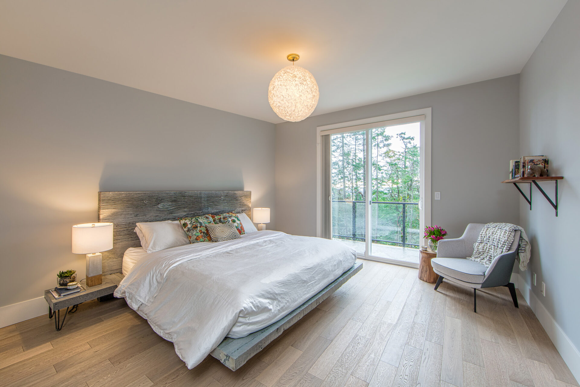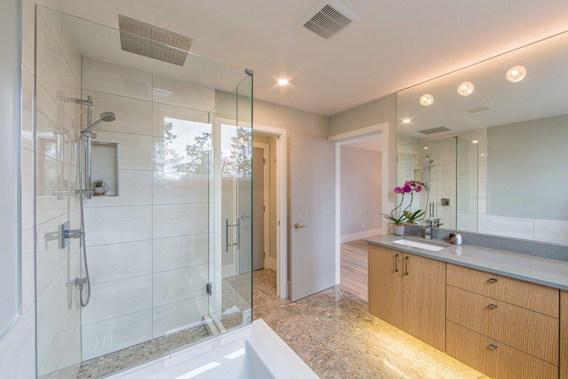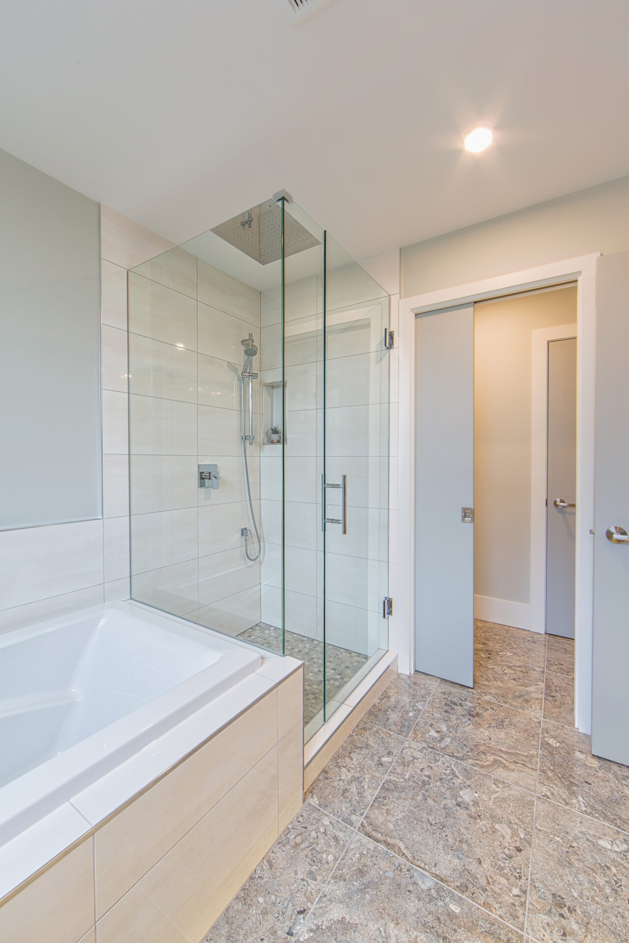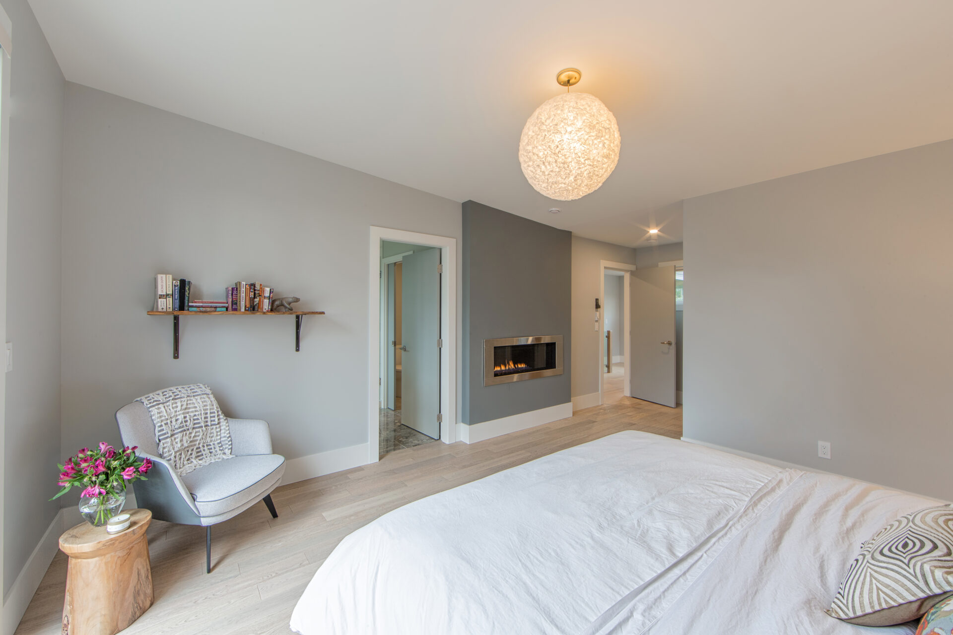 The open-concept layout connects the kitchen, dining and living areas, creating a bright and inviting space. Bold quartz countertops and an etched glass backsplash complement rift-sawn white oak cabinetry. Bathrooms are elevated with extensive tile work and floating vanities topped with quartz countertops.