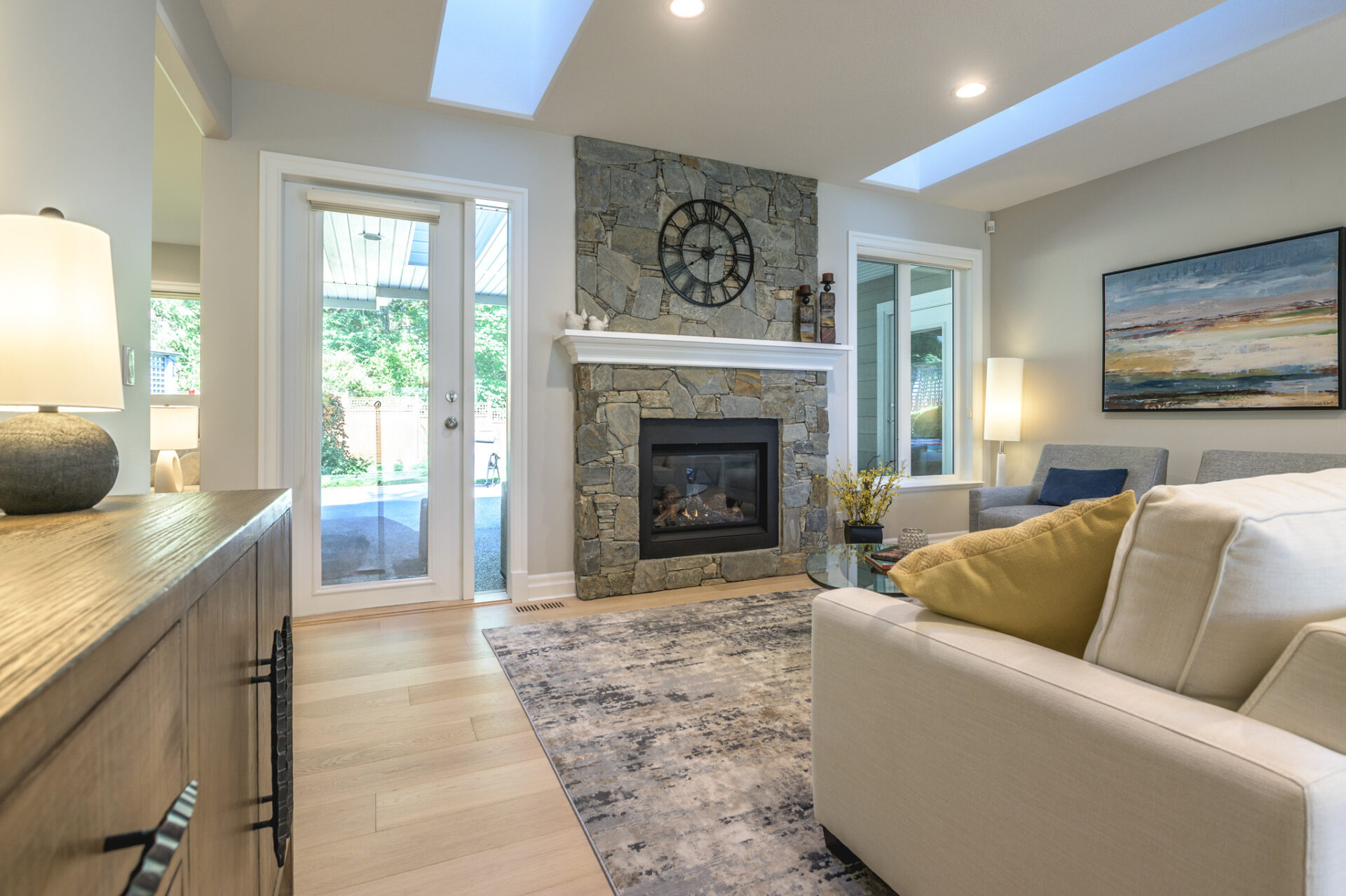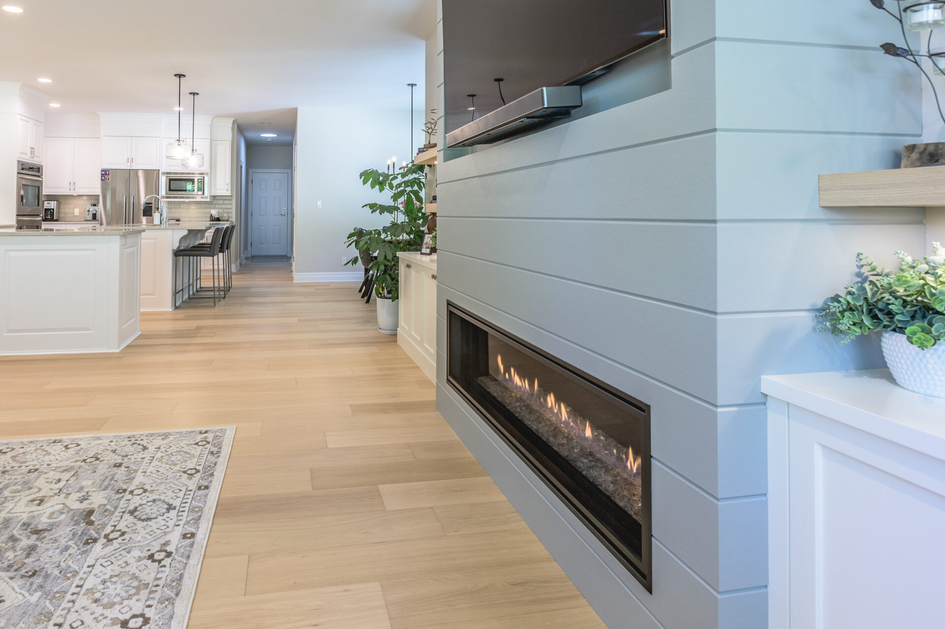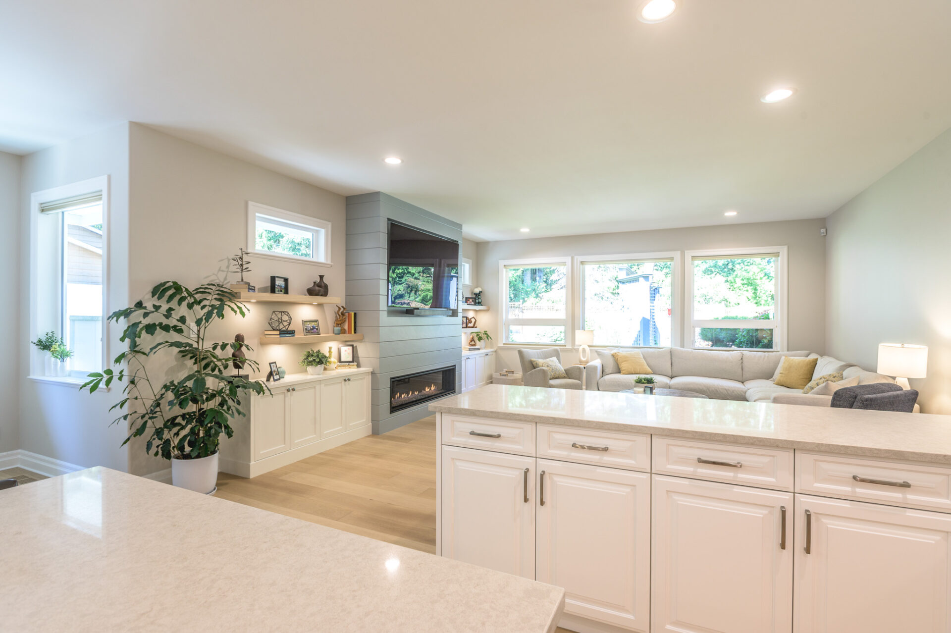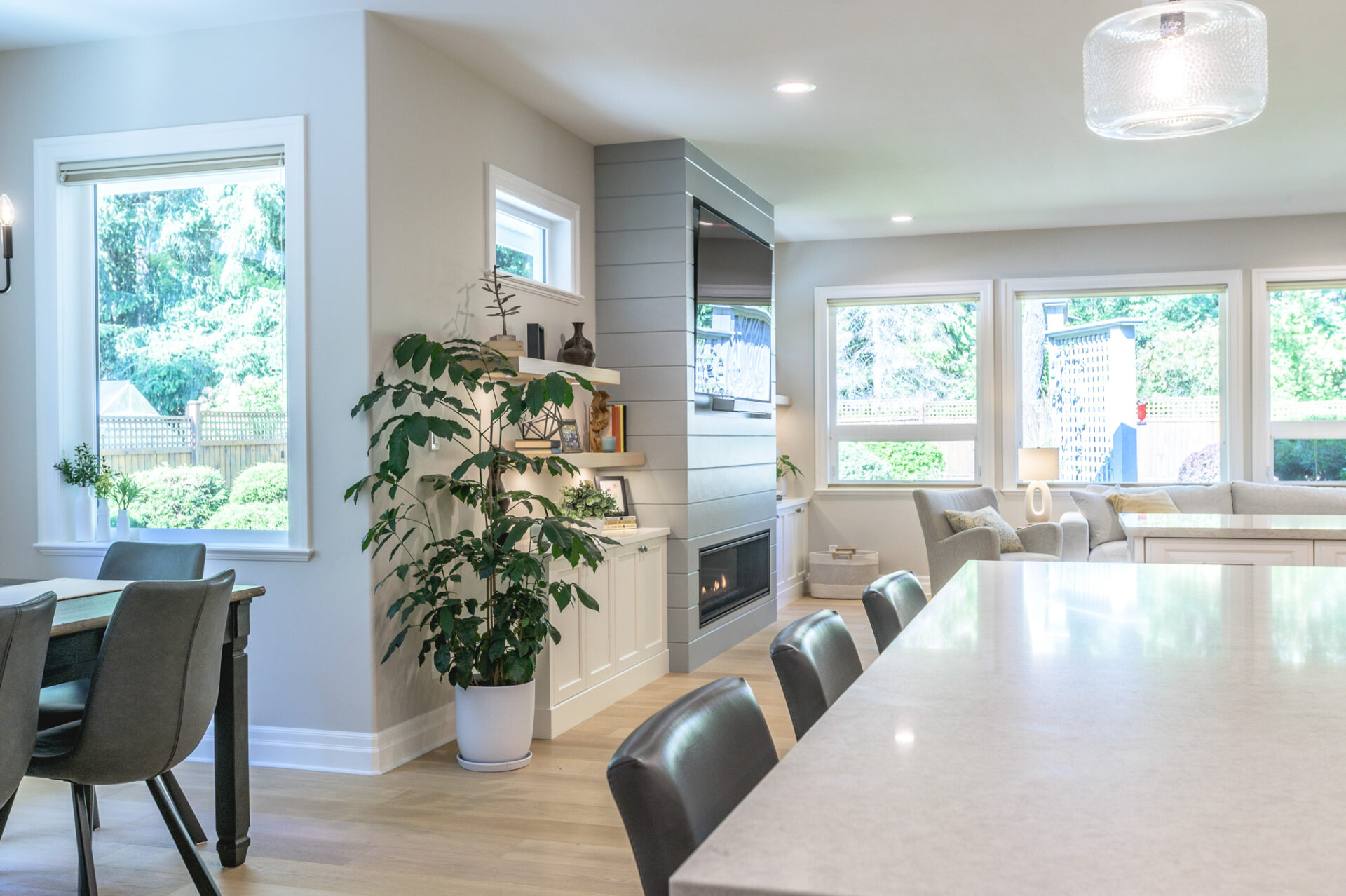 Creative Concepts Construction worked closely with the homeowners and delivered with precision and creativity. The interior renovation featured a complete kitchen transformation, including refinished cabinetry, new quartz countertops, and upgraded bathroom vanities. All hardwood flooring was replaced with elegant, engineered oak, while every tile floor received a fresh update. The showpiece was the entertainment wall in the sitting area, which included a new gas fireplace framed by built-in cabinetry with tongue-and-groove detailing, floating shelves, and two new windows on either side—flooding the space with daylight. The ensuite bathroom was updated with a new vanity, quartz countertops, and new tile flooring. Contemporary light fixtures were added throughout, paired with a fresh, modern paint palette. Behind the scenes, a new hot-water-on-demand system was installed, and all HVAC systems were serviced and upgraded.