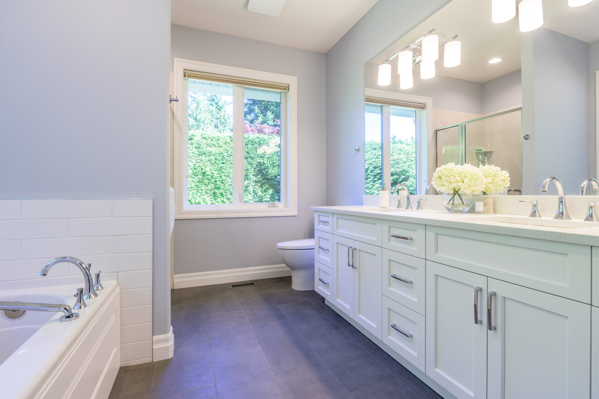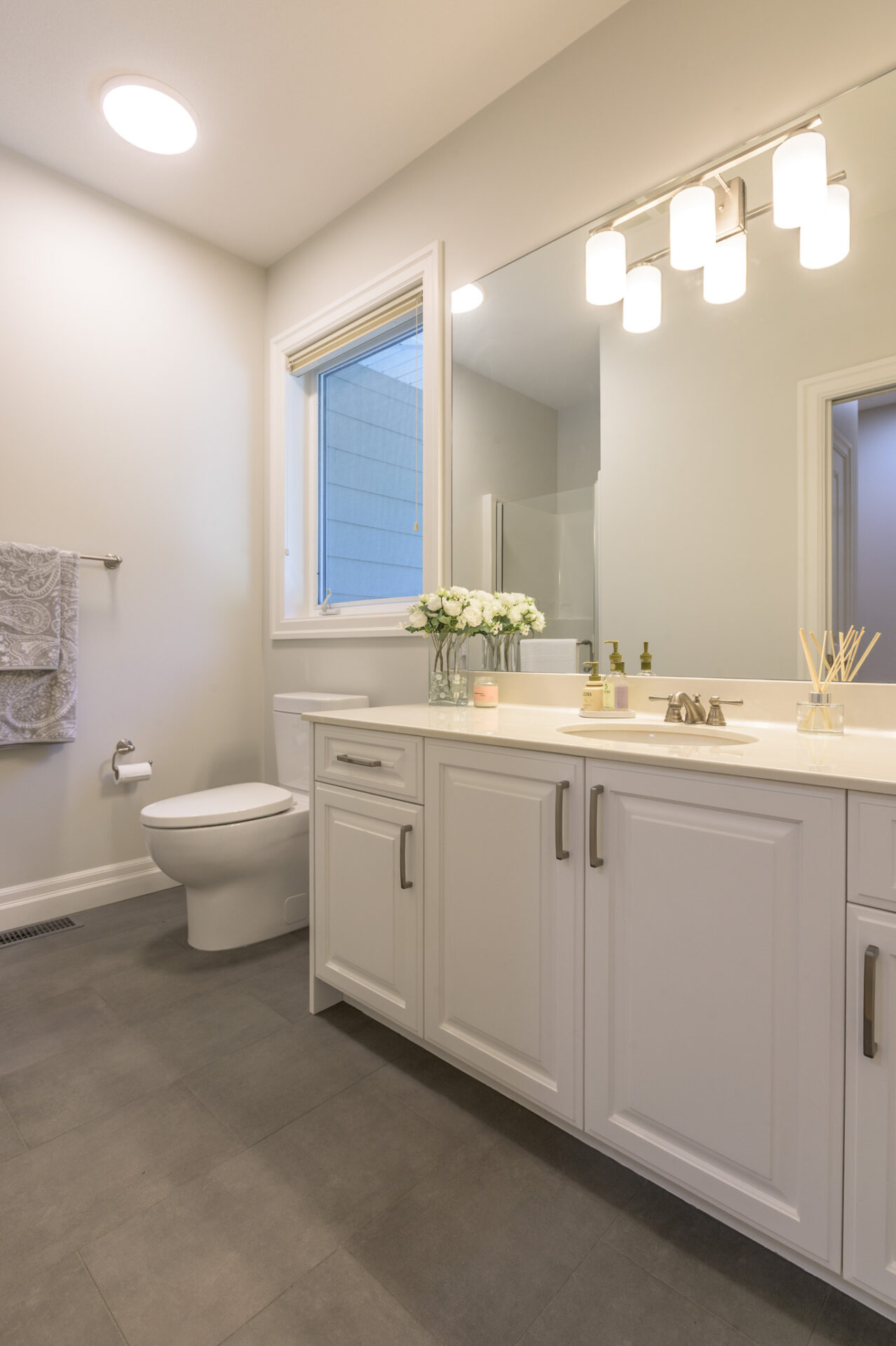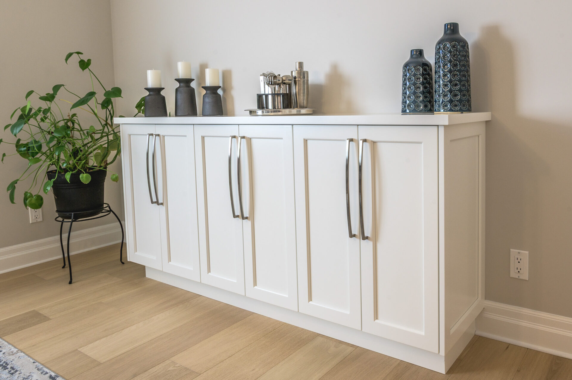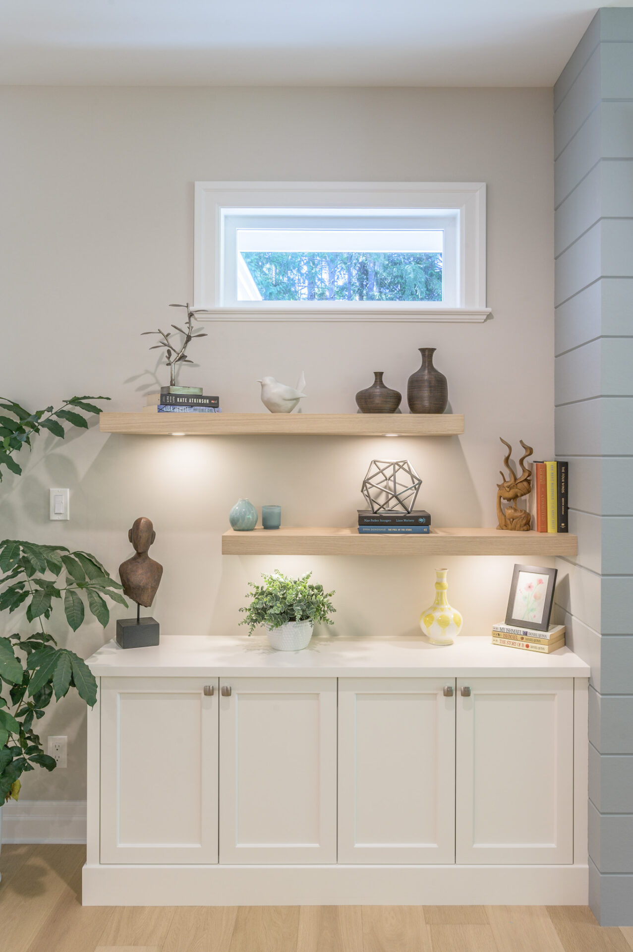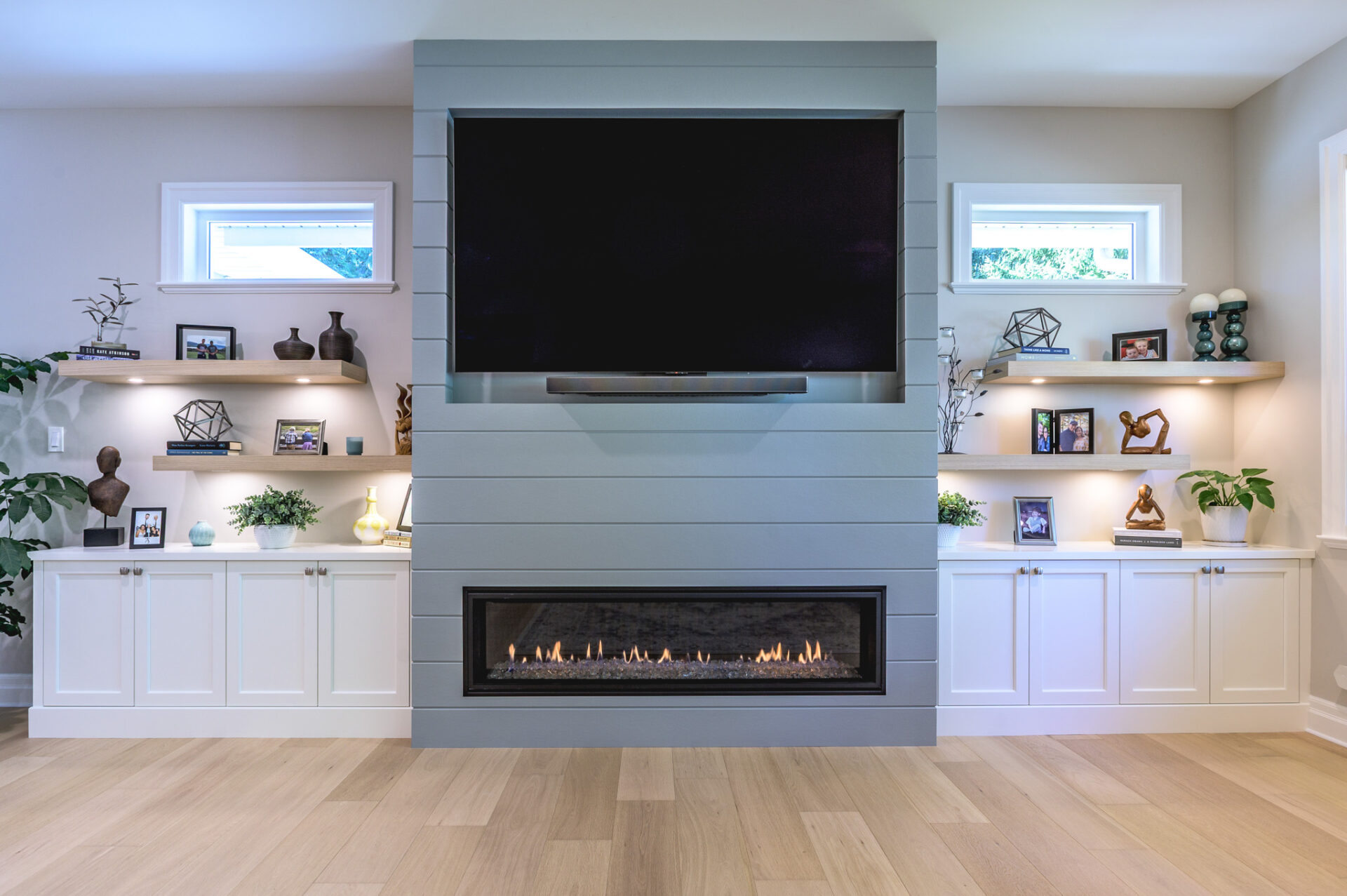 Creative Concepts Construction worked closely with the homeowners and delivered with precision and creativity. The interior renovation featured a complete kitchen transformation, including refinished cabinetry, new quartz countertops, and upgraded bathroom vanities. All hardwood flooring was replaced with elegant, engineered oak, while every tile floor received a fresh update. The showpiece was the entertainment wall in the sitting area, which included a new gas fireplace framed by built-in cabinetry with tongue-and-groove detailing, floating shelves, and two new windows on either side—flooding the space with daylight. The ensuite bathroom was updated with a new vanity, quartz countertops, and new tile flooring. Contemporary light fixtures were added throughout, paired with a fresh, modern paint palette. Behind the scenes, a new hot-water-on-demand system was installed, and all HVAC systems were serviced and upgraded.