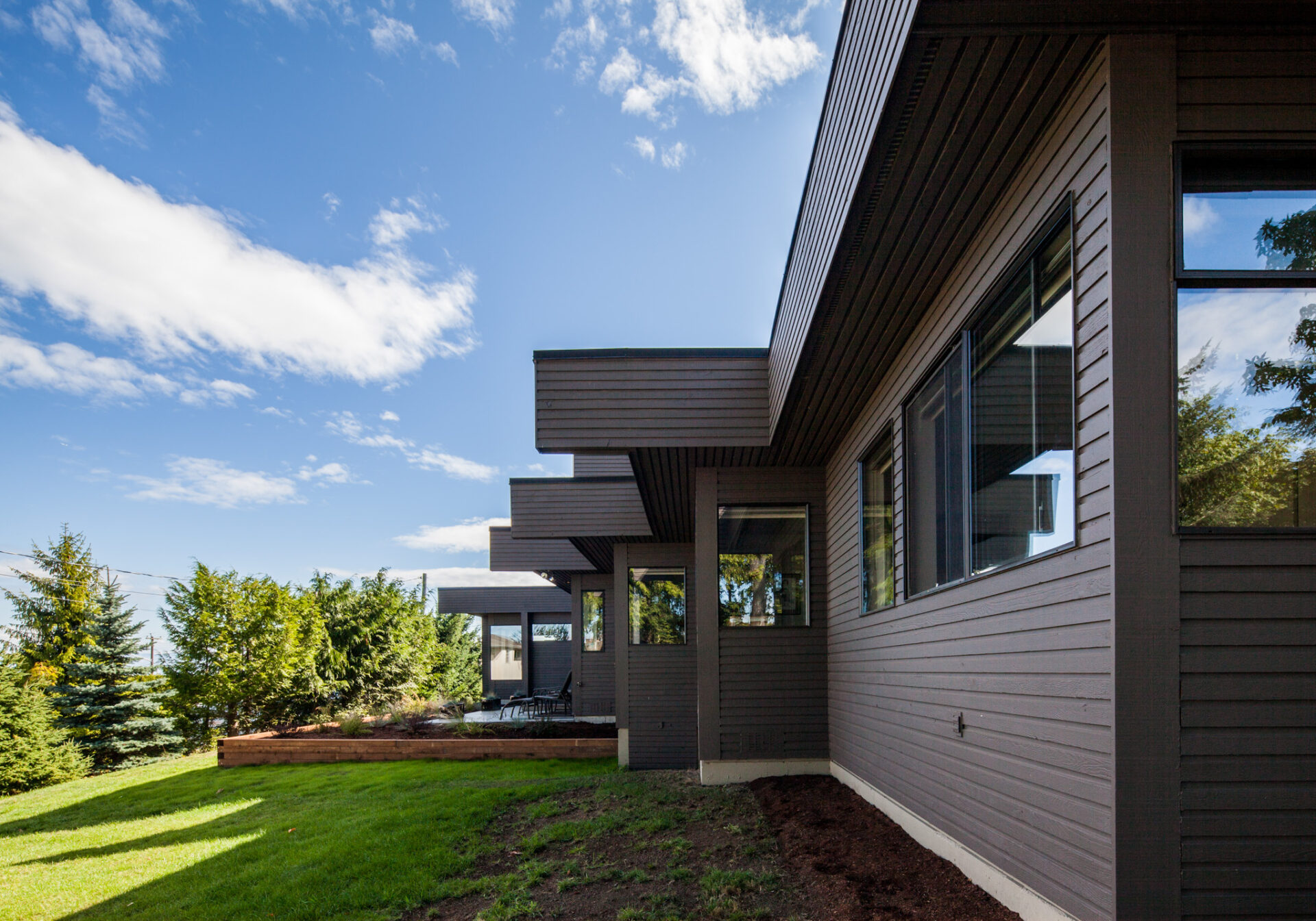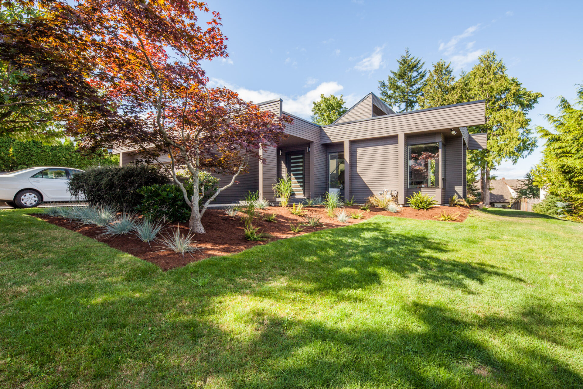 This stunning transformation began with a complete exterior refresh, including updated siding and modern paint colors. A handcrafted contemporary wood fence, new deck, and concrete slab work to seamlessly complement the original modern style.