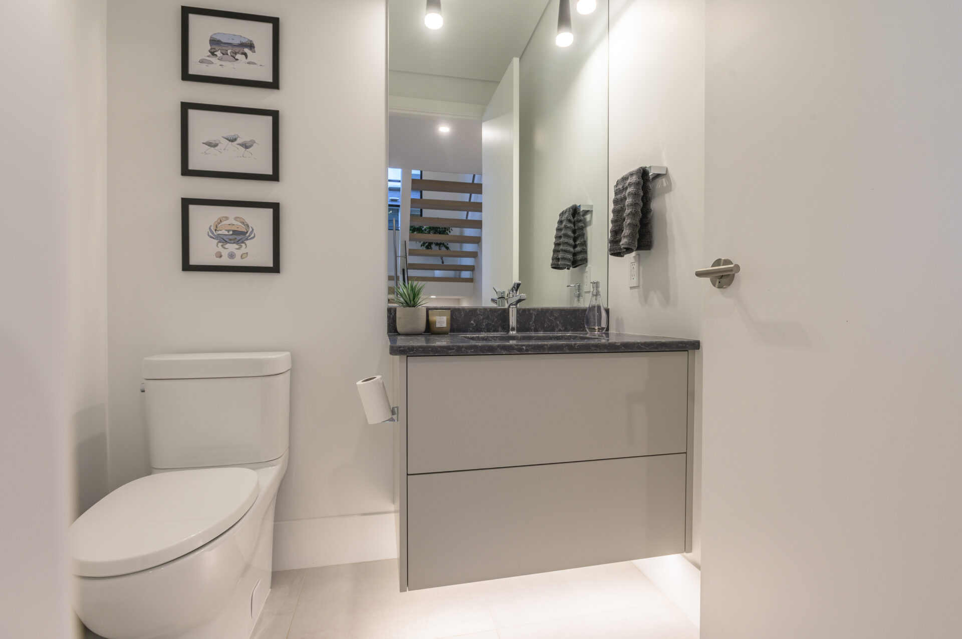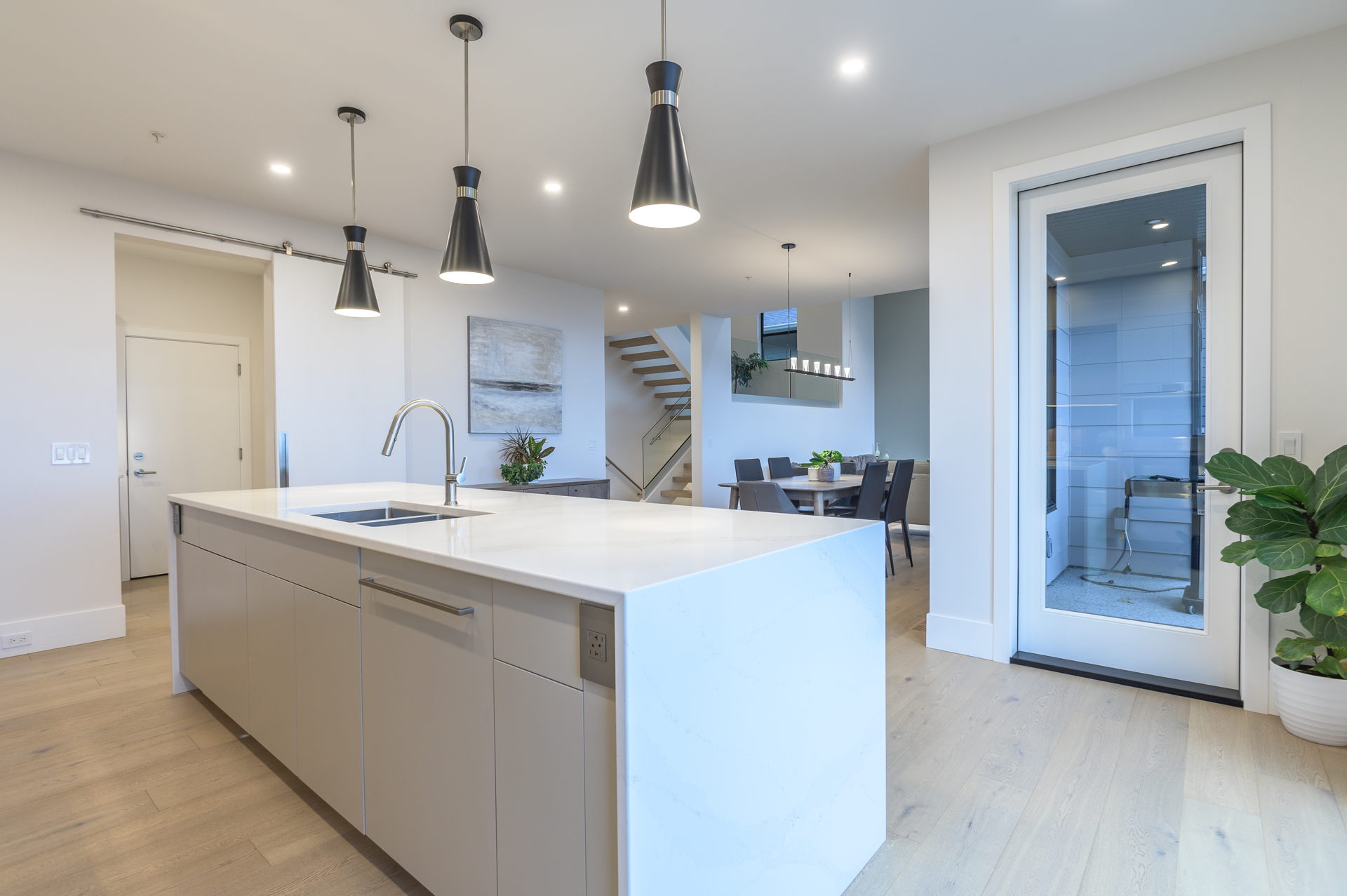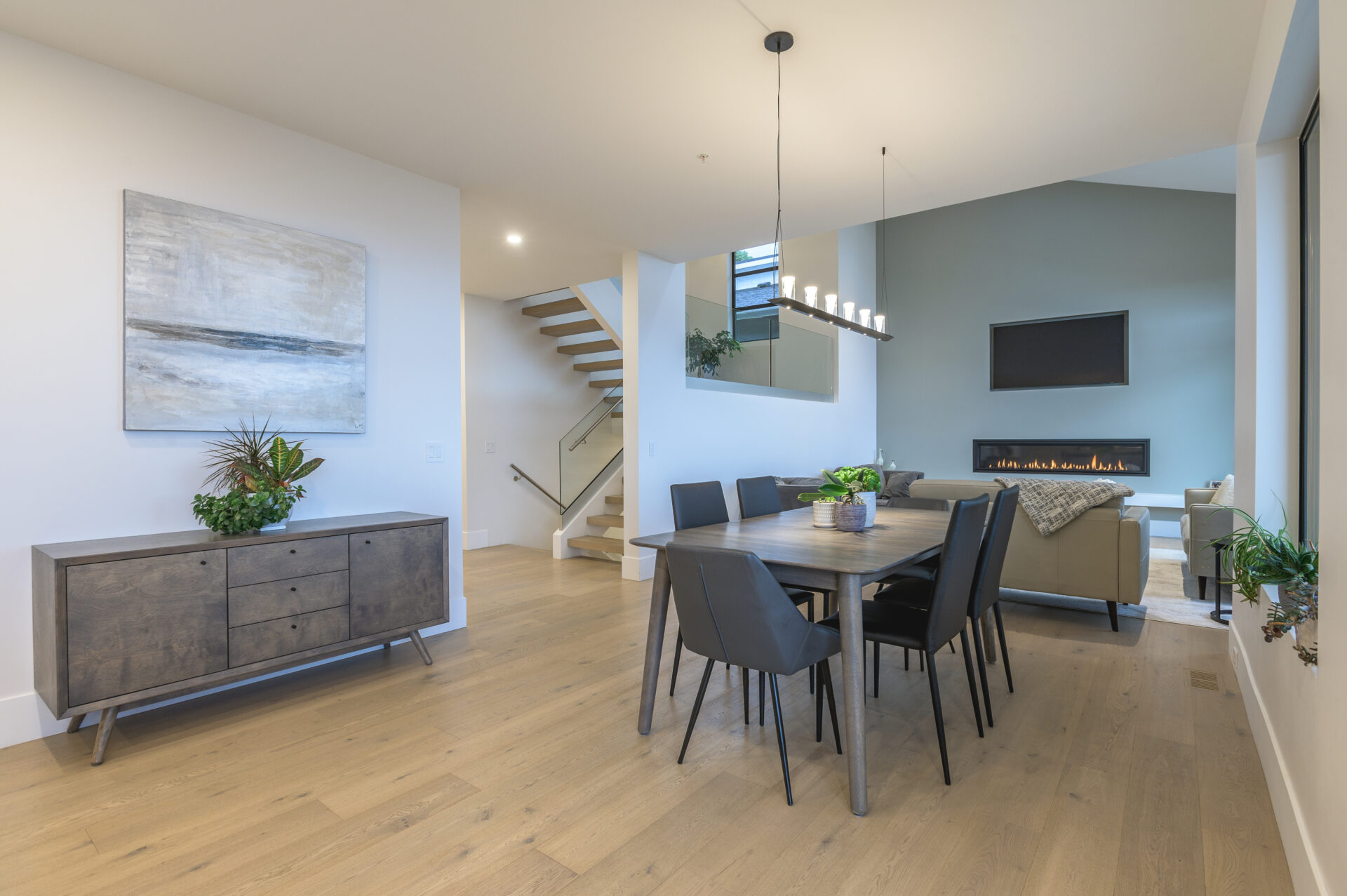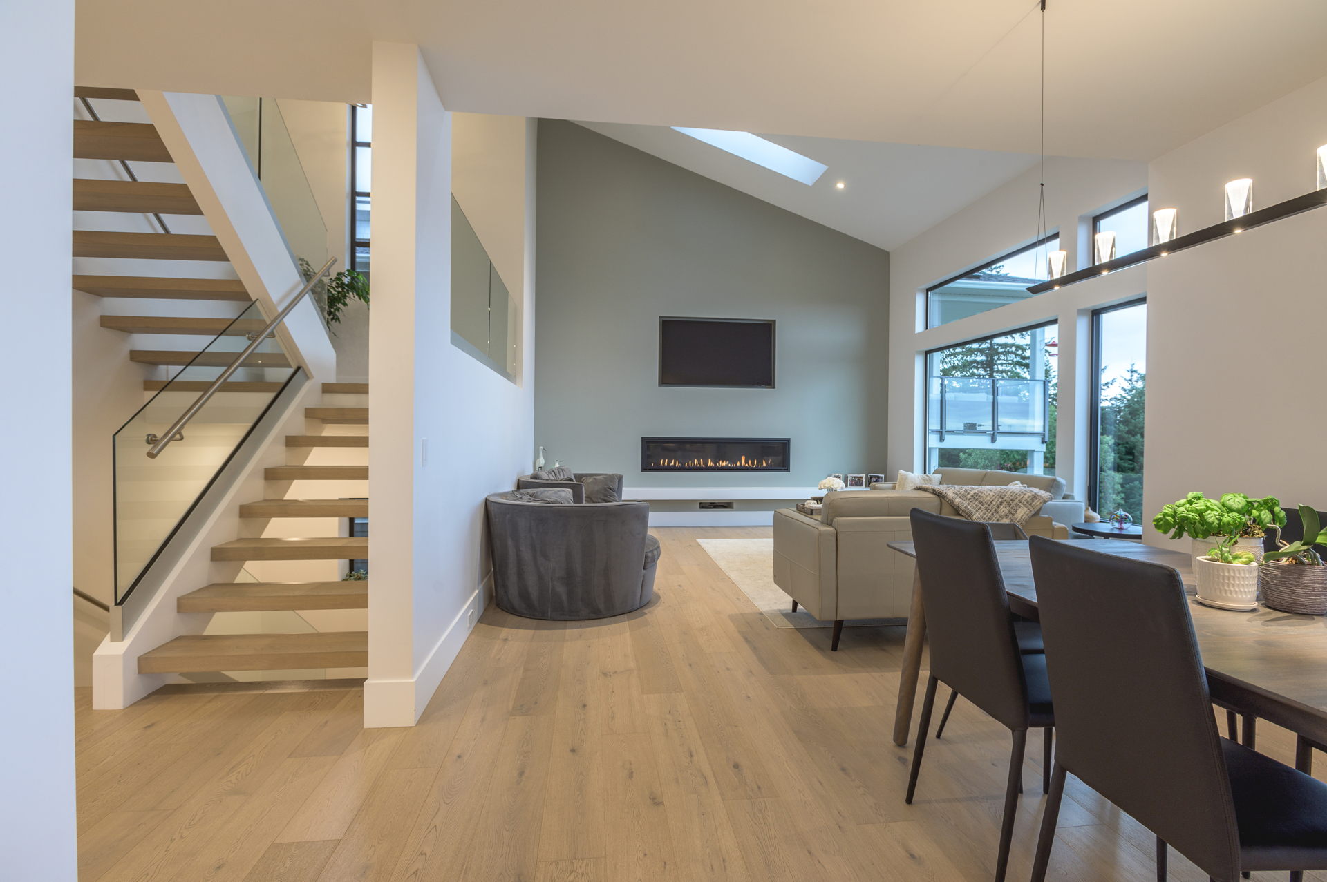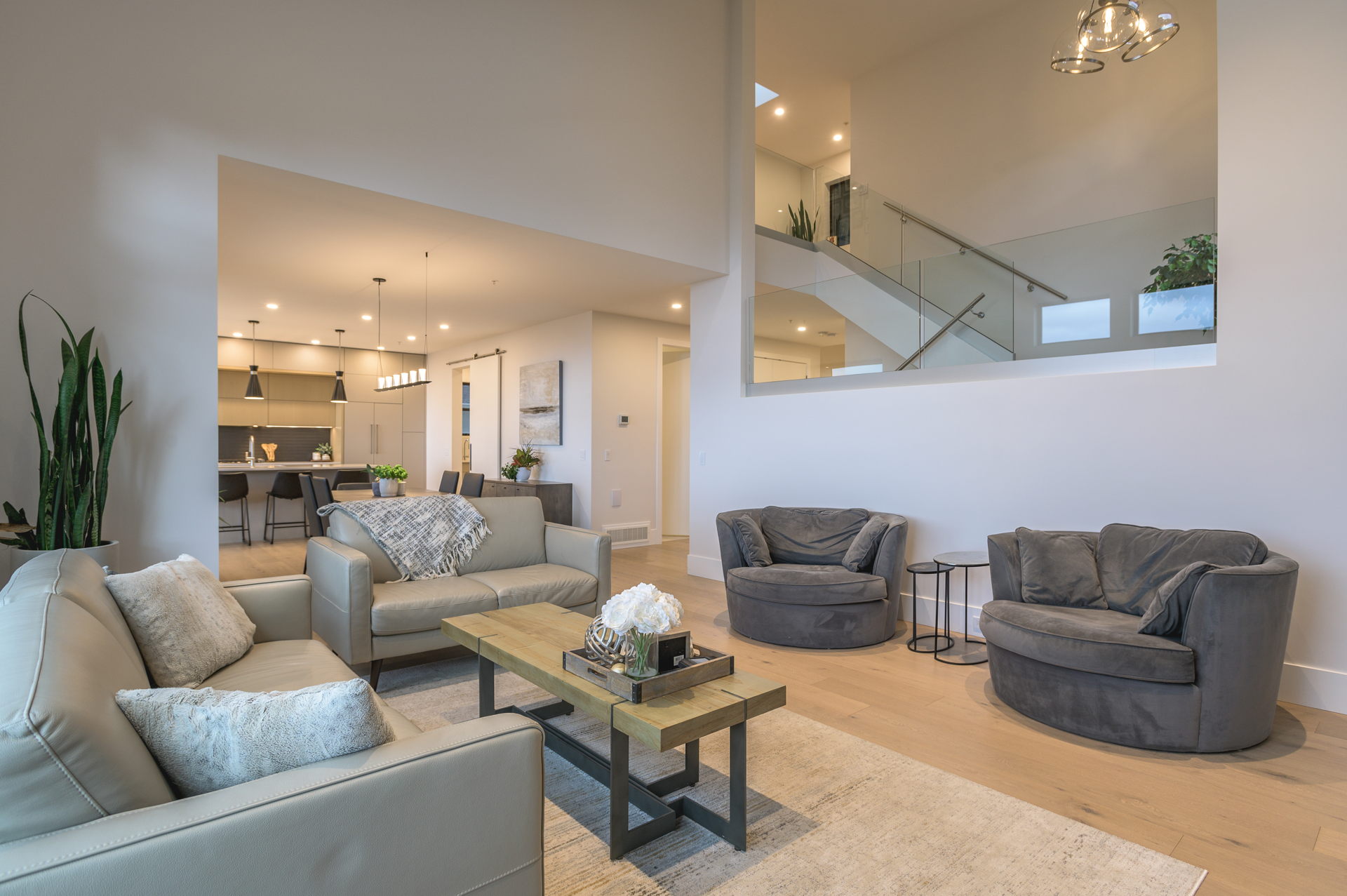 Inside, the open-concept kitchen, dining and living area is perfect for modern living. Custom cabinetry combines rich wood tones with sleek painted finishes, a large island with plenty of seating for guests is paired with luxurious quartz countertops. Wide-plank engineered hardwood floors bring warmth throughout the house, while bathrooms feature custom tile work, and a curb-less shower in the ensuite. Elegant glass finishes are showcased on the stunning staircase which displays one of the many exclusive light fixtures suspended from the vaulted ceiling. Every detail reflects expert craftsmanship and high-end design that Creative Concepts Construction is recognized for.