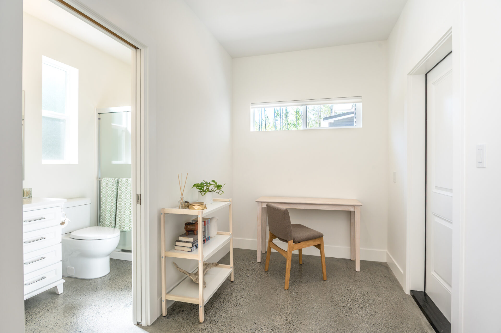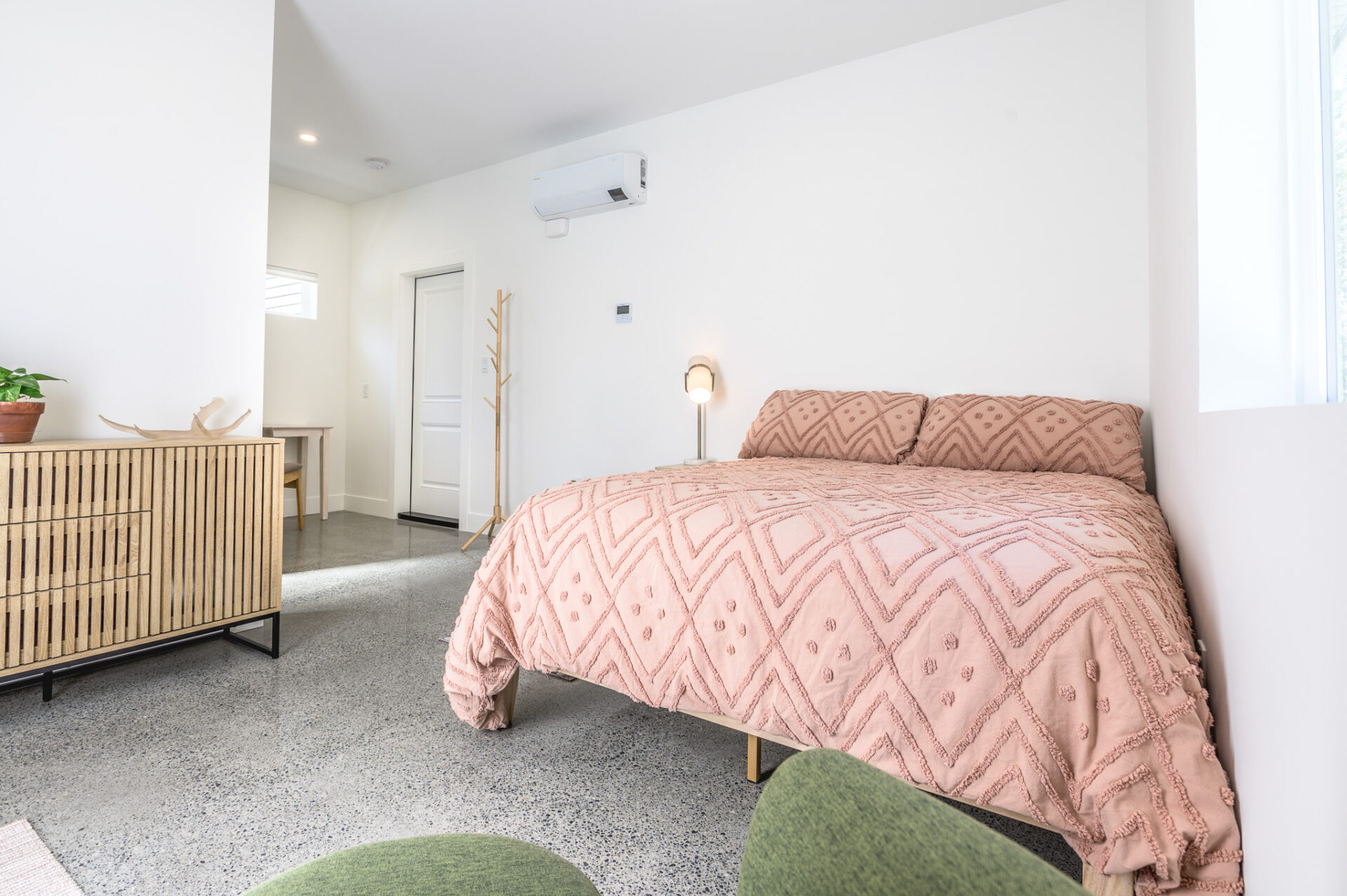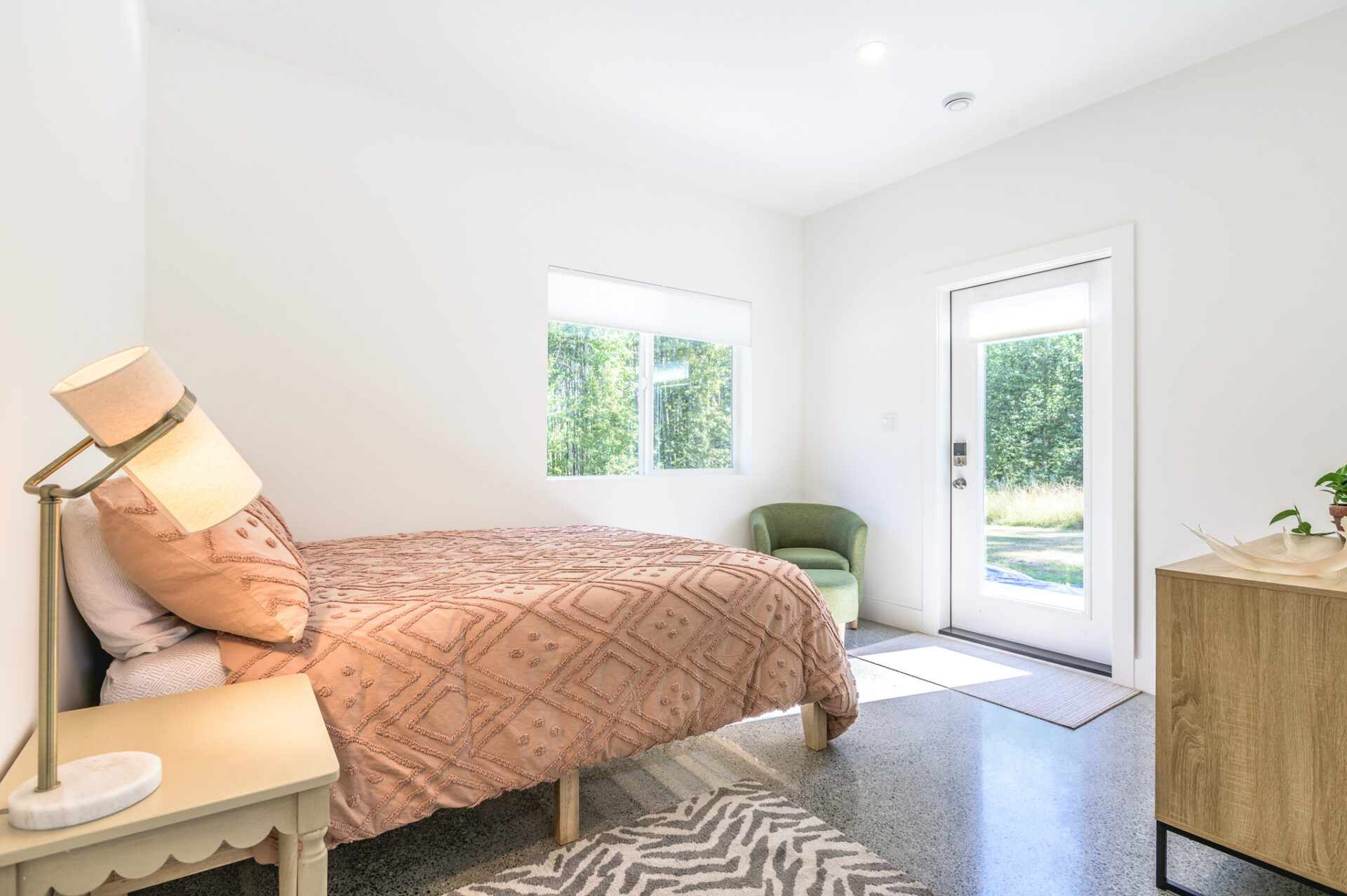 Inside, polished concrete floors bring durability and modern appeal to the attached suite, which includes a cozy bedroom area, comfortable seating space, and a spa-inspired ensuite with a walk-in shower. Truly a 5 Star accommodation for guests and family. A high-efficiency mini-split system ensures guests enjoy year-round comfort with both heating in the winter and cooling in the summer.